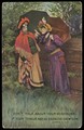 Two men wearing dresses in a garden: one is handing the other sticks of chewing gum as an alternative to gossip. Colour process print, 1915.