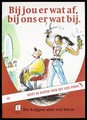 A hairdresser raising her scissors and comb in the air after removing all but a tuft of the hair from her client who sits on a red stool; an analogy to cutting the funds of AIDS Fonds. Colour lithograph.