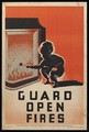 A log fire with a guard in front, which a little boy touches with his rattle. Colour lithograph.