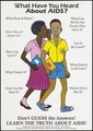 A school girl whispers into the ear of a boy 'What have you heard about AIDS?''; an advertisement for AIDS education from the Ministry of Health AIDS Control Programme (English version). Colour lithograph, ca. 1995 (?).