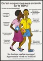 A school girl whispers into the ear of a boy 'What have you heard about AIDS?''; an advertisement for AIDS education from the Ministry of Health AIDS Control Programme (French version). Colour lithograph, ca. 1995 (?).