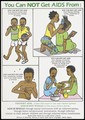 Four illustrations demonstrating ways in which you can not get AIDS from (French version); an advertisement for AIDS education from the Ministry of Health AIDS Control Programme. Colour lithograph, ca. 1995 (?).