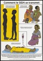 Illustrations showing how AIDS is spread including two naked figures for sexual intercourse, a man being injected with infected blood, an infected woman during pregnancy and an infected blood transfusion; an advertisement for AIDS education from the Ministry of Health AIDS Control Programme (French version). Colour lithograph, ca. 1995 (?).