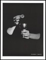 The arms of a man emerge from the darkness holding a silver communion cup into which a condom is about to be dropped; a safe-sex and AIDS prevention message. Lithograph by T. Kanar, 1993.