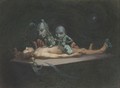 An unconscious naked man lying on a table being attacked by little demons armed with surgical instruments; representing the effects of chloroform on the human body. Watercolour by R. Cooper.