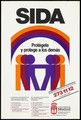 Two sets of parallel orange, red and purple figures joined by one arm beneath a similar coloured rainbow below the words 'AIDS, protect each other'in Spanish; an advertisement for a confidential AIDS helpline featuring a list of people who are at risk of AIDS and a list of preventive measures; advertisement by the Comunidad de Madrid. Colour lithograph, ca. 1992.