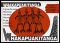 Four decorative Maori figures within a red oval representing an advertisement for Whakapuakitanga, a support group for young gay or bisexual Māori men; advertisement by the NZ AIDS Foundation and Te Roopu Tautoko Trust. Colour lithograph by Paul Henckel [?], 1993.
