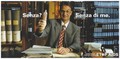 A man in a suit sits at a desk in front of rows of bookshelves with one hand holding a pencil on a pile of paperwork and the other raising a thumb in the air wearing a condom; with the message: 'Without? Without me'; French version of a series of 'Stop SIDA' [Stop AIDS] campaign posters by the Federal Office of Public Health, in collaboration with the l'Aide Suisse contre le SIDA. Colour lithograph.