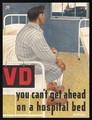 An American sailor sitting on a hospital bed, prevented by venereal disease from joining his ship. Colour lithograph, ca. 1948.