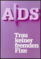 A syringe forming the 'i' of AIDS with the message: "AIDS. Don't trust other people's fixes" representing an advertisement by the AIDS-Koordination NRW. Colour lithograph by Papen, Hansen.