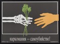 A skeletal hand offering opium poppies to a living hand. Colour lithograph after S. Smirnov, 1987.