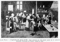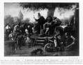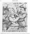 M0002914: A quack doctor removing stones from a patient's head in a crowd of people