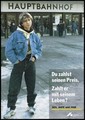 A rentboy at a railway station with a message emphasizing his right to safe sex. Colour lithograph by Alan Warren for the Deutsche AIDS-Hilfe e.V.