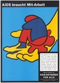 A naked man lies with his eyes closed with one foot touching a lit candle held by a golden cupid; he lies on his side floating above an array of gold gift-wrapped presents among other items with one arm raised towards a glowing gold star with a gold cloud bearing a cupid, a personified gold moon and a falling teddy bear; includes the message in German: 'excluded because of AIDS'; one of a series of posters by the AIDS-Hilfe Schweiz/Aide Suisse contre le SIDA/Aiuto AIDS Svizerro. Colour lithograph by Etienne Francey and Daniel Ammann.