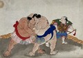 Two sumo wrestlers with a referee (?). Colour woodcut, 18--.