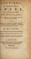 Cautions against the immoderate use of snuff. Founded on the known qualities of the tobacco plant; and the effects it must produce when this way taken into the body: and enforced by instances of persons who have perished miserably of diseases, occasioned, or rendered incurable by its use / by Dr. J. Hill.