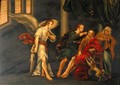 The angel Raphael curing the blindness of Tobit. Oil painting by Hendrick Martensz. Sorgh, 16--.