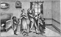 A tooth-drawer extracting a tooth from a standing patient, who is being pick-pocketed by a woman. Line engraving after L. van Leyden, 1523.