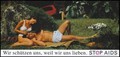 A woman in white underwear strokes the hair of a man lying down wearing boxer shorts with a portable radio, their car and a fox in the undergrowth nearby; two packs of red condoms lie in a bag to the left; German version of a series of safe sex 'Stop AIDS' campaign posters by the Federal Office of Public Health in collaboration with the AIDS-Hilfe Schweiz. Colour lithograph.