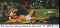 A woman in white underwear strokes the hair of a man lying down wearing boxer shorts with a portable radio, their car and a fox in the undergrowth nearby; two packs of red condoms lie in a bag to the left; an Italian version of a series of Stop AIDS campaign posters by the Federal Office of Public Health, in collaboration with Aiuto AIDS Svizzero. Colour lithograph.