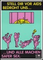 A yellow cat crying behind bars with four smiling pink naked couples in various sexual positions below with the message in German: 'Imagine AIDS threatens us ... and all make safer sex' an advertisement for safe sex by the AHS [AIDS-Hilfe Schweiz], ASS [AIDS Suisse Contre le SIDA] and AAS [Aiuto AIDS Svizzero]. Colour lithograph.