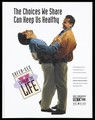 A man leans back laughing as he holds under another man; advertisement for an information brochure 'Safer Sex; choices for Life' for gay and bisexual men by AIDS Vancouver. Colour lithograph by Jane Weitzl.