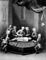 M0018374: William Cheselden giving an anatomical demonstration to six spectators in the anatomy-theatre of the Barber-Surgeons' Company, London