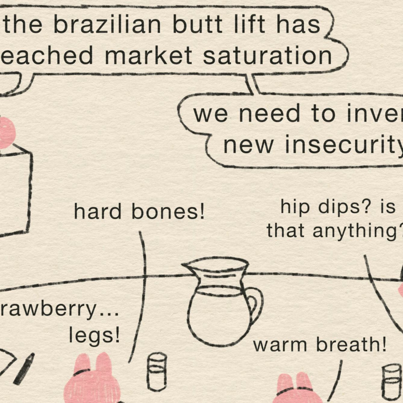 Sales have slumped. But this morally bankrupt CEO remains hellbent on fracturing people’s mental and physical wellbeing for profit. Can his team of minions turn things around with some fresh body insecurities to sell to the masses? This series of comics by Clarice Tudor follows the aftermath of their emergency board meeting. Because beauty is in the eye of the shareholder.