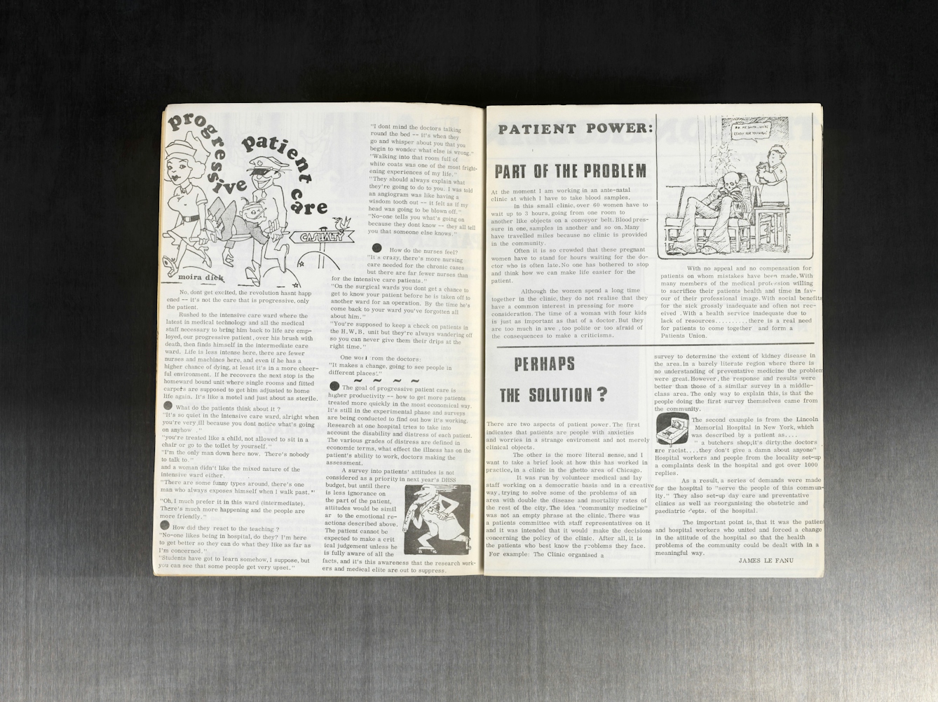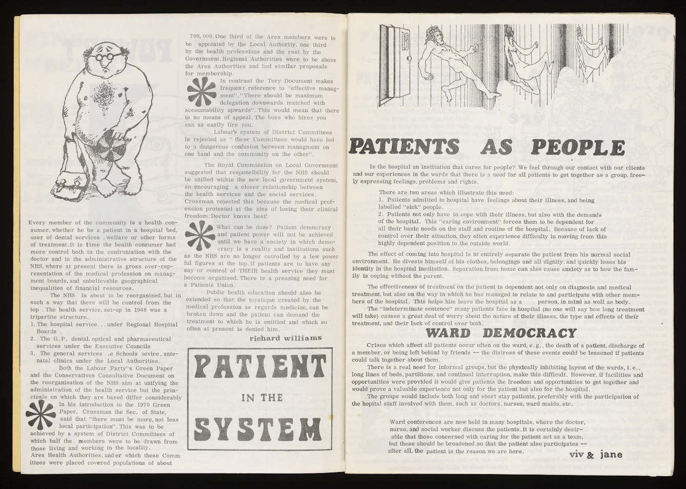 Medical scandals in the late 1960s and 1970s put patient rights in the spotlight – poor-quality care experienced by the elderly and mentally ill at Ely Hospital and Farleigh Hospital hit the headlines. There was also increasing awareness that NHS patients were routinely being used for medical trials without their consent. These high-profile failings prompted action to address the injustices faced by patients. Groups were formed, like the Patients Association, to advocate for better conditions for patients, and assert the rights of the patient as a consumer. As a grassroots group, Needle took a more radical point of view, which was set out in the eighth issue, ‘Patient Power!’ They plainly rejected medical hierarchy and asserted that patients should be the ones driving the direction of health services. This echoes the rallying cry of the disability movement: ‘nothing about us without us’. Needle similarly demanded patients be taken seriously and have a proper say in the care they receive.