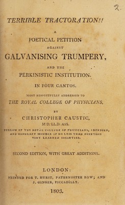 Terrible tractoration!! A poetical petition against galvanising trumpery, and the Perkinistic Institution, in four cantos / By Christopher Caustic [pseud].