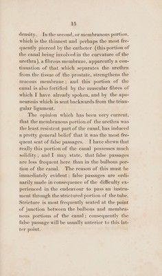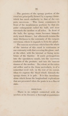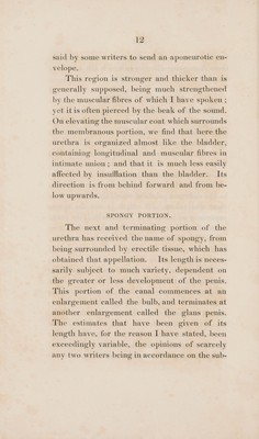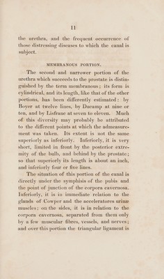 ![1] the urethra, and the frequent occurrence of those distressing diseases to which the canal is subject. MEMBRANOUS PORTION. The second and narrower portion of the urethra which succeeds to the prostate is distin- guished by the term membranous; its form is cylindrical, and its length, like that of the other portions, has been differently estimated: by Boyer at twelve lines, by Ducamp at nine or ten, and by Lisfrane at seven to eleven. Much of this diversity may probably be attributed to the different points at which the admeasure- ment was taken. Its extent is not the same superiorly as inferiorly. Inferiorly, it is very short, limited in front by the posterior extre- mity of the bulb, and behind by the prostate ; so that superiorly its length is about an inch, and inferiorly four or five lines. The situation of this portion of the canal is directly under the symphisis of the pubis and the point of junction of the corpora cavernosa. Inferiorly, it is in immediate relation to the elands of Cowper and the acceleratores urine muscles; on the sides, it is in relation to the corpora cavernosa, separated from them only by a few muscular fibres, vessels, and nerves ; and over this portion the triangular ligament is](https://iiif.wellcomecollection.org/image/b3309388x_0031.jp2/full/800%2C/0/default.jpg)