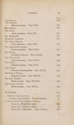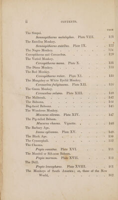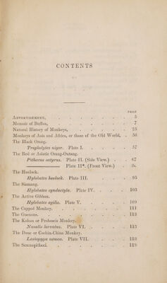 ![CONTENTS ADVERTISEMENT, Memoir of Buffon, ; Natural History of Monkeys, Monkeys of Asia and Africa, or those of the Old World, The Black Orang. Troglodytes niger. Plate I. The Red or Asiatic Orang-Outang. Pithecus satyrus. Plate II. (Side View.) Plate I1*. (Front View.) The Hoolock. ' Hylobates hoolock. Plate IIT. The Siamang. Hylobates syndactyla. Plate IV. Hylobates agilis. Plate V. The Guenons. The Kahau or Proboscis ] Monkeys Ab Nasalis larvatus. Plate VI. Lasiopyga nemea. Piate VII. The Semnopitheci.](https://iiif.wellcomecollection.org/image/b29289397_0002_0009.jp2/full/800%2C/0/default.jpg)