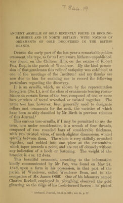 Ancient armillae of gold recently found in Buckinghamshire and in North Britain; with notices of ornaments of gold discovered in the British Islands / [Albert Way].