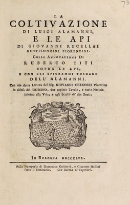 La coltivazione / di Luigi Alamanni, e le Api di Giovanni Rucellai. Colle annotazioni di Ruberto Titi sopra le Api, e con gli epigrammi toscani dell'Alamanni. Con una dotta lettera del Sig. Giovanni Checozzi ... in difesa del Trissino, due copiose tavole, e varie notizie intorno alla vita, e agli scritti de'due poeti.