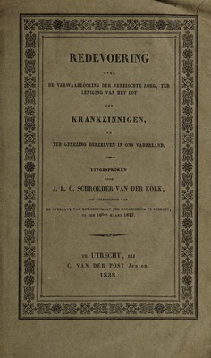 Redevoering over de verwaarloozing der vereischte zorg, ter leniging van het lot der krankzinnigen, en ter genezing derzelven in ons vaderland / [Jacobus Ludovicus Conradus Schroeder van der Kolk].