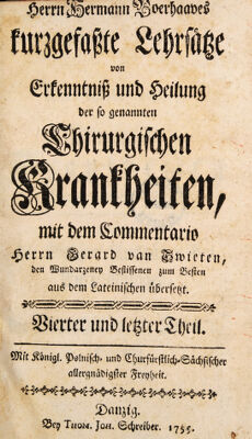 Herrn Hermann Boerhaaves kurzgefasste Lehrsätze von Erkenntniss und Heilung der so genannten chirurgischen Krankheiten / mit dem commentario Herrn Gerard van Swieten.