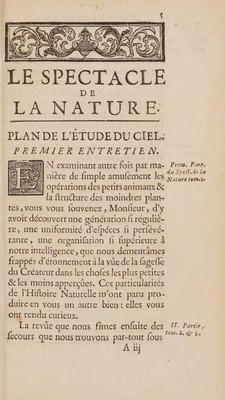 Le spectacle de la nature, ou, entretiens sur les particularités de l'histoire naturelle, qui ont paru les plus propres à rendre les jeunes-gens curieux, et à leur former l'esprit / [Anon].