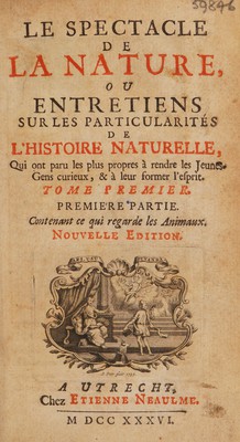 Le spectacle de la nature, ou, entretiens sur les particularités de l'histoire naturelle, qui ont paru les plus propres à rendre les jeunes-gens curieux, et à leur former l'esprit / [Anon].