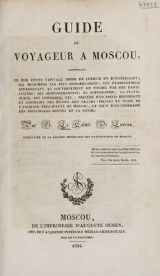 Credit: Guide du voyageur à Moscou ... précédé d'un précis historique ... des règnes des Grands-Princes et Tsars de l'ancienne principauté de Moscou; et suivi d'un itinéraire des principales routes de la Russie / [G Lecointe de Laveau]. Source: Wellcome Collection.