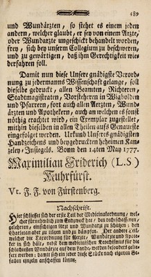 Credit: Unterricht von dem Collegium der Aerzte in Münster wie der Unterthan bey allerhand ihm zustossenden Krankheiten die sichersten Wege und die besten Mittel treffen kann seine verlorne Gesundheit wieder zu erhalten nebst den münsterschen Medicinalgesetzen. Entworffen / durch C.L. Hoffmann. Source: Wellcome Collection.