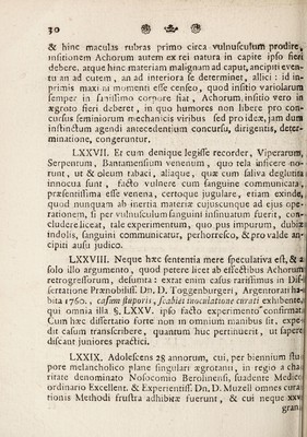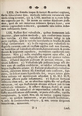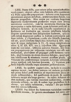 Credit: Problema practicum, an achorum insitio, imitando variolarum insitionem, pro curandis pueritiae morbis rebellibus tuto tentari possit consensu amplissimissenatus ... pro loco ... legitime capessendo / proponit, Ferdinandus Christoph Oetinger ... respondente Samuele Theophilo Gmelin. Source: Wellcome Collection.