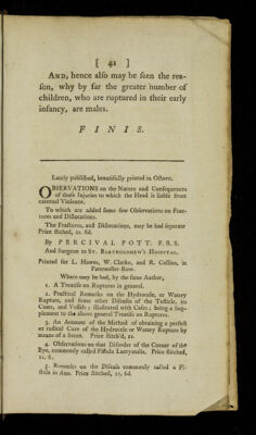An account of a particular kind of rupture, frequently attendant upon children, and sometimes met with in adults, viz. : that in which the intestine, or omentum, is found in the same cavity, and in contact with the testicle / by Percival Pott.