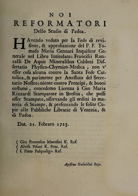 Francisci Roncalli ... De Aquis mineralibus Coldoni ad oppidum Leuci in agro Mediolanensi dissertatio.