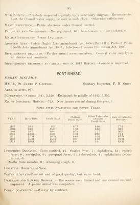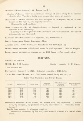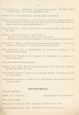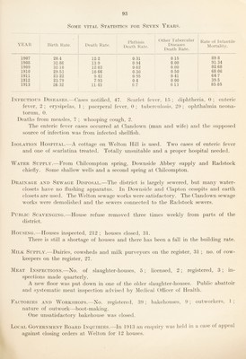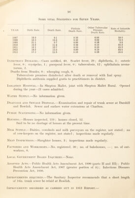 ![Some vital Statistics for Seven Years. YEAR. Birth Rate. Death Rate. Phthisis Death Rate. Other Tubercular Diseases Death Rate. Rate of Infantile Mortality. 1907 18-9 91 0.38 0.00 50.5 1908 18-3 12.4 038 0.00 729 1909 211 9.7 0.00 0-38 9.0 1910 160 11.4 0 56 0.18 95.2 1911 18 1 12.7 059 0.39 43.9 1912 18.5 13.3 0.00 019 64.5 1913 17-3 11-5 0.39 039 34.4 Infectious Diseases.—Cases notified, 49. Scarlet fever, 29 ; diphtheria, 5 ; enteric fever, 0 ; erysipelas, 1 ; puerperal fever, 0 ; tuberculosis, 12 ; ophthalmia neona¬ torum, 2. Deaths from Measles, 0 ; whooping cough, 0. Tuberculosis premises disinfected after death or removal with Izal spray. Diphtheria antitoxin supplied gratis to practitioners in district. Isolation Hospital.—In Shepton Mallet, joint with Shepton Mallet Rural. Opened during the year—21 cases admitted. Water Supply.—No information given. Drainage and Sewage Disposal.—Examination and repair of trunk sewer at Darshill and Bowlish. Sewer and surface water extensions at Charlton. Public Scavenging.—No information given. Housing.—Houses inspected, 119 ; houses closed, 12. Said to be no shortage of houses at the present time. Milk Supply.—Dairies, cowsheds and milk purveyors on the register, not stated ; no of cow-keepers on the register, not stated ; inspections made regularly. Meat Inspections.—Slaughter houses, 3 ; inspections made regularly. Factories and Workshops.—No. registered, 30 ; no. of bakehouses, — ; no. of out¬ workers, 0. Local Government Board Inquiries.—None. Adopted Acts.—Public Health Acts Amendment Act, 1890 (parts II and III) ; Public Health Acts Amendment Act, 1907 (greater portion of it) ; Infectious Diseases Prevention Act, 1890. Improvements required.—The Sanitary Inspector recommends that a short length of ]8in. trunk sewer be relaid at Bowlish. Improvements recorded as carried out in 1913 Report.](https://iiif.wellcomecollection.org/image/b30111651_0102.jp2/full/800%2C/0/default.jpg)