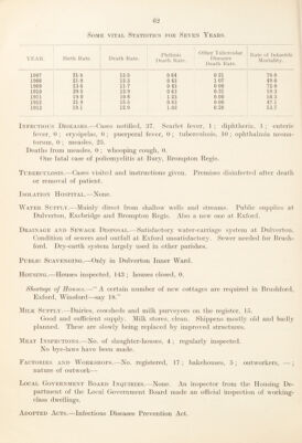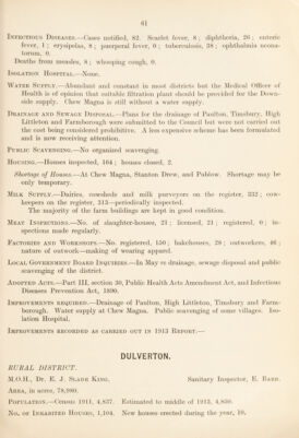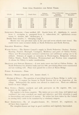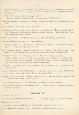 ![fever, 1 ; erysi[)elas, 7 ; j)ner})eral fever, 0 ; tuberculosis, 51 ; ojihthalniia neona¬ torum, 0. Deaths from measles, 4; \vlK)0})ing cough, 1. Jdemises disinfected after death or removal of case of tuberculosis. Isolation Hospital.—Hospital in district belonging to Bath City to which cases are sent. Water Supply.—No fresh supplies installed. Drainage and Sewage Disposal.—Joint sewerage sclieme for Monkton Combe, Bath- ford, Batheaston, Bathamjiton, Swainswick and Claverton. Freshford and Pease- down drainage schemes in liand. Public Scavenging.—At Batham])ton, Batheaston, Bathford and Weston. Housing.^—Houses inspected, 240 ; houses closed, 8. Shortage of Houses.—At Camerton, Dunkerton and Wellow. The demand in these ])laces is being met by private enterprise. Milk Supply.—Dairies, cowsheds and milk purveyors on the register, 114; cow- keepers on the register, 105 ; no. of inspections made during the 3ear, 131. Meat Inspec'itons.—No. of slaughter-houses, 13; licensed, 2; registered, 11. The slaughter-houses are small and unsatisfactoiy but the}^ are not often used— the meat supply comes ])rincipally from Bristol or Bath. Carcasses and offal of five oxen were destroyed as unfit for human consumption. Factories and Workshops.—No. registered, 3 ; bakehouses, 14 ; outworkers—no lists received. Local Government Board Inquiries.—In May for sanction to borrow £17,000 for carrying out the sewage scheme for parishes round Bath. Adopted Acts.—Infectious Diseases Prevention Act, 1800, and Public Health Acts Amendment Act, 1800, certain sections. Improvements required.—Slaughter-house bye-laws for all the district. Improvements recorded as carried oltt in 1013 Report.—Progress with three o sewerage schemes. BRIDGWATER. RURAL DISTRICT. M.O.H., Dr. WiLBERFORCE Thompson. Sanitary Inspector, Richard Popham. Area, in acres, 85,07(). Copulation.—Census 1011, 18,203. No. OF Inhabited Houses, 4,373. Estimated to middle of 1013, 18,203. New houses erected during the year, 8.](https://iiif.wellcomecollection.org/image/b30111651_0061.jp2/full/800%2C/0/default.jpg)