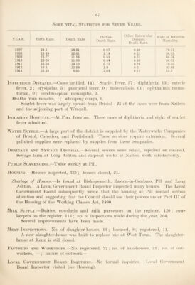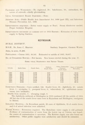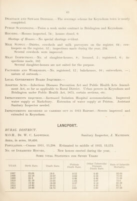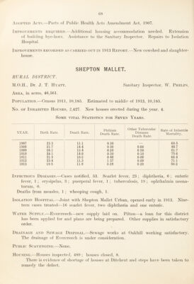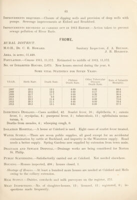 ![Improvements required.—Closure of dipping wells and provision of deep wells witli pumps. Sewerage improvements at Exford and Mrushford. Improve.ments recorded as carried out in 1913 Report.—Action taken to jircvent sewage pollution of River Barle. RURAL DISTRICT. FROME. Dr. C. R. Howard. Sanitaiy Inspectors, J. A. Beynon, J. B. Holroyd. Area, in acres, 51,448. Population.—Census 1911, 11,172. Estimated to middle of 1913, 11,172. No. OF Inhabited Houses, 2,675. New houses erected during the year, 8. Some vital Statistics for Seven Years. YEAR. Birth Rate. Death Rate. Phthisis Death Rate. Other Tubercular Diseases Death Rate. Rate of Infantile Mortality. 1907 22.5 12.1 0.09 0.00 84.0 1908 20-5 10.0 0-80 017 800 1909 22-7 11.7 0-80 0.26 800 1910 23-1 9.0 0-89 0.17 36 0 1911 22.3 11.4 0.44 0.08 75.6 1912 20.3 11.1 0.45 0.09 70.4 1913 20-3 13.1 0.63 009 57-5 Infectious Diseases.—Cases notified, 42. Scarlet fever, 16 ; diphtheria, 8 ; enteric fever, 1 ; erysipelas, 4 ; puerperal fever, 2 ; tuberculosis, 11 ; ophthalmia neona¬ torum, 0. Deaths from measles, 4 ; whooping cough, 0. Isolation Hospital.—A house at Coleford is used. Eight cases of scarlet fever treated. Water Supply.—There are seven public supplies, all good except for an accidental contamination by cattle at Buckland, and impurity in the Wanstrow sup])ly. Road needs a better supply. Spring Gardens now supplied by extension from town main. Drainage and Sewage Disposal.—Drainage works are being considered for Norton St. Philip. Public Scavenging.—Satisfactorily carried out at Coleford. Not needed elsewhere. Housing.—Houses inspected, 498 ; houses closed, 1. Shortage of Houses.—At least a hundred more houses are needed at Coleford and Hells owing to the colliery extension. Milk Supply.—Dairies, cowsheds and milk purveyors on the register, 272. .Meat Inspections.—No. of slaughter-houses, 13; licensed, 13; registered, 0; in¬ spections made frequently.](https://iiif.wellcomecollection.org/image/b30111651_0067.jp2/full/800%2C/0/default.jpg)
