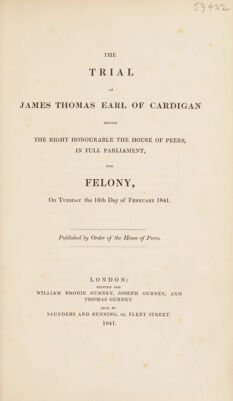 The trial of James Thomas, Earl of Cardigan, before the Right Honourable the House of Peers in full Parliament for felony, on Tuesday, the 16th day of February 1841 / Published by Order of the House of Peers.