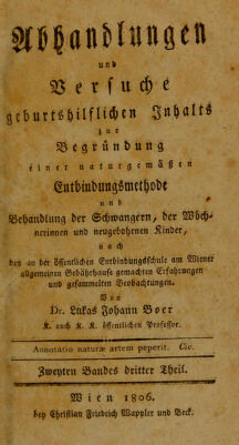 Abhandlungen und Versuche geburtshilflichen Inhalts zur Begründung einer naturgemässen Entbindungsmethode und Behandlung der Schwangern, der Wöchnerinnen und neugebohrnen Kinder, nach den an der öffentlichen Entbindungsschule am Wiener Algemeinen Gebährhause gemachten Erfahrungen und gesammelten Beobachtungen / [Lukas Johann Boër].
