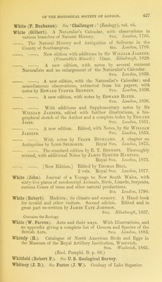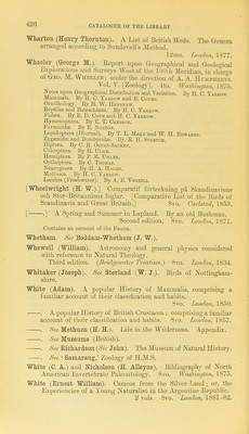 ![Wickliain (Henry Alexander), Rough notes of a .Tourney through the 'Wildeniess, from Trinidad to Para, Brazil, by way of the Great Cataracts of tlie Orinoco, Atabapo, and Rio \egro. 8vo. LohUmi, 1872. Wiedemann (Clir. End. WUh.). Diptera exotica. Part I. 8vo. Kiliae, 1821, , Aussereuropiiische zweifliigelige Insekten. 2 vols. 8vo. Hamm, 1828-30. . See Pekiodicals : Germany (Berlin). Archiv fiir Zoologie. Wiedersheim (Robert). Salamandrina perspicillata und Geotriton fuscus; Versuch einer vergleichenden Anatomie der Salaman- drinen, mit besonderer Beriicksichtigung der Skelet-Verbaelt- nisse. 8vo. Genua, 1875. , Das Kopfskelet der Drodelen; ein Beitrag zur vergleichenden Anatomie des Wirbelthier-Schadels. 8vo. Leipzig, 1877. . Labyrintlioclon riitimeyeri. Ein Beitrag zur Anatomie von Gesammtskelet und Gehirn der triassischen Labyrinthodonten. 4to. Zurich, 1878. . Die Anatomie der Gymnophionen. 4to. Jena, 1879. . Lebrbuch der vergleichenden Anatomie der Wirbelthiere. Theil I. 8vo. Jena, 1882. . Grundriss der vergleichenden Anatomie der Wirbelthiere. 8vo. Jena, 1884, . Das Eespirations-system der Chamaeleoniden. 8vo. Freiburg, 1886. . Elements of the Comparative Anatomy of Yertehrates : adapted from the German of E. WiEnEESHEin, by W. Xewtox Paekee ; with Additions by the Author and Translator. 8vo. London, 1886. Wied-Neuwied (Maximilian, Prince of). Travels in Brazil, in the years 1815-1817. Part I. 4to. London, 1820. . Eeise nach Brasilien in den Jahren 1815 bis 1817. 2 vols. FranJcfurt-a.-M., 1820—21. . Abbildungen zur Naturgeschichte Brasdiens. [EecueU de Planches coloriees d’Auimaux du Bresil.] Folio. Weimar, 1822—31. . Eeise in Brasilien in den Jahren 1817 bis 1820. 3 vols. 4to. Miinchen, 1823-31. . Beitriige zur Naturgeschichte von Brasihen. 4 vols. in 6. 8vo. Weimar, 1825—33. Band I. Amphibien. (1825.) „ IT. Silugethiere. (1826.) „ III, Vogel. (1830-31.) ,, IV. Vogel und Insecten (1832-33.) . Ueber den Quetz paleo des Seba, oder Merrems Uromasty.v cyclurus. dto. Bonn, 1827.](https://iiif.wellcomecollection.org/image/b24864419_0438.jp2/full/800%2C/0/default.jpg)