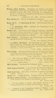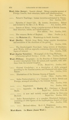 ![Wood. (John George). Insects abroad. Being a popular account of Foi’eign Insects, their structure, habits and transformations. 8vo. Loivdon, 1874. . Nature’s Teachings : human invention anticipated by Nature. . 8vo. London, 1877. . Episodes of Insect Life. By Acheta Domebtica. Edited and revised by the Kev. J. G. Wood. 8vo. London, 1879. . Insects at Home : being a popular account of British Insects, their structure, habits, and transformations. New edition. 8vo. London, 1881. . The common Moths of England. 12mo. London [n. d.]. . See Waterton (C.). Wanderings in South America. Wood (Neville). British Song Birds : being popular descriptions and anecdotes of the choristers of the groves. 8vo. London, 1836. . The Ornithologist’s Text-book: being reviews of Ornitholo- gical Works, with an appendix containing discussions of various ■ topics of interest. 8vo. London, 1836. Wood (Searles Valentine). Monograph of the Crag Mollusca. (Palceontographical Society.) 2 vols. 4to. London, 1848-55. Wood (William). Zoography : or, the Beauties of Nature displayed in select descriptions from the animal, and vegetable, with addi- tions from the mineral kingdom. 3 vols. Koyal 8vo. London, 1807. • . General Conchology; or a description of shells arranged according to the Linnean system, and illustrated with plates from Nature. London, 1815. . Illustrations of the Linnean Genera of Insects. 2 vols. 12mo. London, 1821. . Index Testaceologicus; or a Catalogue of Shells British and Eoreign, arranged according to the Linnean System. 8vo. London, 1825. . . Supplement. 8vo. London, 1828. . . Appendix. See Hanley (S.). Catalogue of Eecent Boyal 8vo. London, 1842-56. . . A new and entu’ely revised edition, by Stevaxus Hanley. Eoyal 8vo. London, 1856. . Index Entomologicus; or a complete Illustrated Catalogue, consisting of 1944 figm-es of the Lepidopterous Insects of Great Britain. London, 1839. . . Eevised edition. By J. 0. Westwood. Eoval 8vo. London, 1854. Wood-Mason. See Mason (James Wood-).](https://iiif.wellcomecollection.org/image/b24864419_0444.jp2/full/800%2C/0/default.jpg)